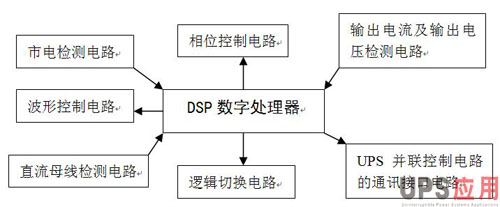 2)现在UPS并机系统不设主从关系,一般采用以数字信号处理器为核心,辅以必要的外围功能单元电路构成。它主要由DSP、波形控制接口电路、相位控制电路、逻辑切换控制电路、直流母线检测电路、输出电流及输出电压检测电路、市电检测电路和UPS并联控制系统的通讯接口电路组成。采用全数字处理器DSP技术,简化了电路,使UPS具有快速反应能力,增强负载不平衡条件下的相位控制能力。如图1所示。