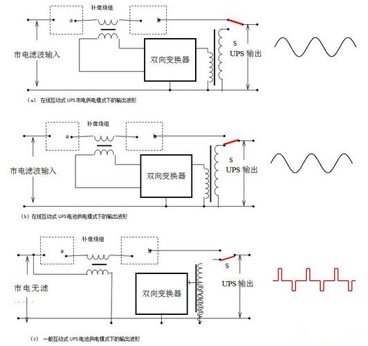 看一个产品是否优秀首先看它是不是被人们认可进而去仿制。原来在线互动式电路结构只有APC一家独有,而现在国内众多UPS制造商早已开始仿效。除了和上述的图1(a)和(b)输出正弦波波形一致的国内产品外,还有的推出了电路更加简单的像图1(c)所示的国内一些厂家的产品,虽然也有的称为“在线互动式”,但在电路结构上区别很大。尽管在市电模式下的输出电压也是正弦波,但在电池模式下的输出电压就是准方波了,这完全是后备式UPS输出波形的特征;再有就是它的补偿绕组电压也是不稳定的,因为它来自市电变压器而不是内部逆变器,如图1(c)所示,这个电压是随着市电波动而变化的,补偿效果就不如图1(a)和(b)了。至于能不能具有上述的在线式的结果还有待于证实。
