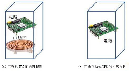 图2 在线互动式UPS和一般工频机UPS的内部损耗比较