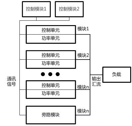 分布+集中式架构的模块化UPS功率模块内整流、逆变的控制是分布的,而均流逻辑等控制则是集中控制模式,即采用独立集中的控制模块(如图2中控制模块)来检测市电的频率和相位,然后向每个模块发出同步信号,各个功率模块接受到此同步信号后通过自身的控制环输出相应频率相位的正弦波。当市电丢失时,集中控制模块会自激产生同步信号发送给各个UPS模块来保证各单元的输出同频同相。同时在均流的控制实现形式方面,集中式架构的模块化UPS依靠控制模块来检测整个系统的负载电流,然后除以系统模块数量来作为各个UPS模块的均流参考值,进而与各模块输出电流比较后求出偏差值来不断调整各模块的输出电流,以保证系统内模块间良好的均流度。分布+集中控制逻辑模式的优点在于采用独立的均流与逻辑控制单元,均流度更好,且控制逻辑层级清晰,各功率模块之间不存在竞争关系,软件逻辑可靠性较高。为了保证集中控制单元的可靠性,避免单点故障,一般采用该架构的UPS控制单元及通讯线路均会做1+1备份。1+1热备份是最常用的备份方式,其可靠性在各类系统长期运行实践中已得到验证。