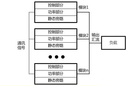 分布式是早期模块化UPS经常使用的一种架构。此类模块化UPS系统层面上等价于数台独立的UPS直接并联,其功率模块利用小型UPS改造而成,可自主独立工作,其特点是:①除整流、逆变的控制外,均流与逻辑切换也由内部控制单元控制;②内置容量与功率模块容量一致的静态旁路,在旁路模式时,由每个模块内的静态旁路共同承担负载。