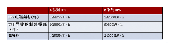 以一个中型数据中心为例,假设IT负载为500kW,A系列UPS效率为93%,B系列UPS效率为96%,空调能效比(EER)为3:1。根据以上条件,分别采用两种UPS所带来的损耗见下表: