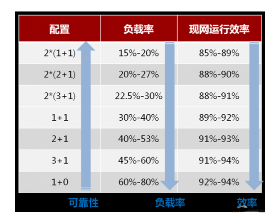 因为以上所讲的三个原因,一般情况下,UPS实际负载率低于40%,冗余越高的,负载率越低(见图四),一些机房UPS负载率会低到20%左右。在低载下,UPS的效率会大打折扣。现网UPS的实际运行效率多数低于90%,给客户造成大量的电力损失。