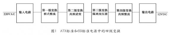 无论是ATX电源还是SSI电源,UPS输出的220V交流电进入IT负载内部后,都必须经四级变换,最后转换成稳定的12V、5V、3.3V的直流电压,提供给IT负载内部的CPU、内存、存储设备、网络通信芯片等“真正的负载”使用。这四级变换分别为(见图1):