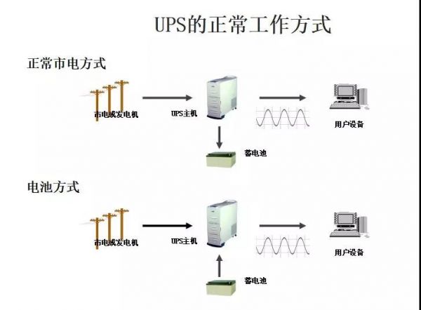 当市电输入正常时,UPS 将市电稳压后供应给负载使用,此时的UPS就是一台交流式电稳压器,同时它还向机内电池充电;当市电中断(事故停电)时, UPS 立即将电池的直流电能,通过逆变器切换转换的方法向负载继续供应220V交流电,使负载维持正常工作并保护负载软、硬件不受损坏。