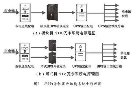 该构架方案,也通常被称为N+X构架,如图2所示。图2(a)所示为模块机N+X冗余系统电原理图;图2(b)所示为塔式机N+X冗余系统电原理图。N是根据负载量选定的UPS基础容量,X是系统备份数量,该系统可以接受“X”数量的设备或者模组出现故障而不影响系统运行。原则上X的数量越大,系统的安全系数越高,个人建议将X设置为1-2较为合适,既可以节省能耗,也具有相应的容错能力。