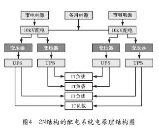 在实际应用案例中,如存在部分终端设备不具有双电源构架的,可以考虑在其前端加入STS设备加以优化。图4所示的2N结构配电系统电原理结构图就可解决问题了。