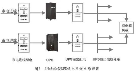 图3给出了2N结构型UPS供电系统电原理图,这也是银行系统普遍采用的宫殿结构。