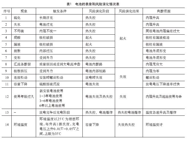 (2)电池的更换标准:通过查阅大量资料文献及标准,包括国家标准(GB)、电力行业标准(DL)、通讯行业标准(YD)等标准,以及注明电池检测仪表厂家(福禄克、日置)等,其中各种标准说法不一,其原因主要是因为市面上生产电池厂商品牌不一,难以进行统一,其中具有代表性的以电池容量为指标,日置仪表检测厂商以内阻检测值的1.5倍为指标,而在实际的生产运行过程当中,蓄电池的负荷能力只是蓄电池检测过程当中一项指标,其中尤为重要的安全风险问题在各类标准中又未曾提及,而安全风险问题对于航站区内等地点又是坚决不能接受的。